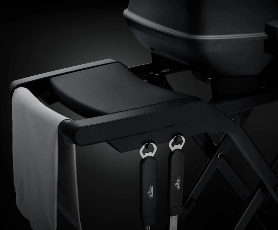 Met zijn praktische zijtafels met bestek en handdoek haken, biedt het solide onderstel plaats voor voorbereidingen en accessoires. Met de grote wielen laat de PRO285X zich ingeklapt praktische transporteren of ophangen aan de wand om plaats te besparen.