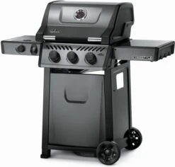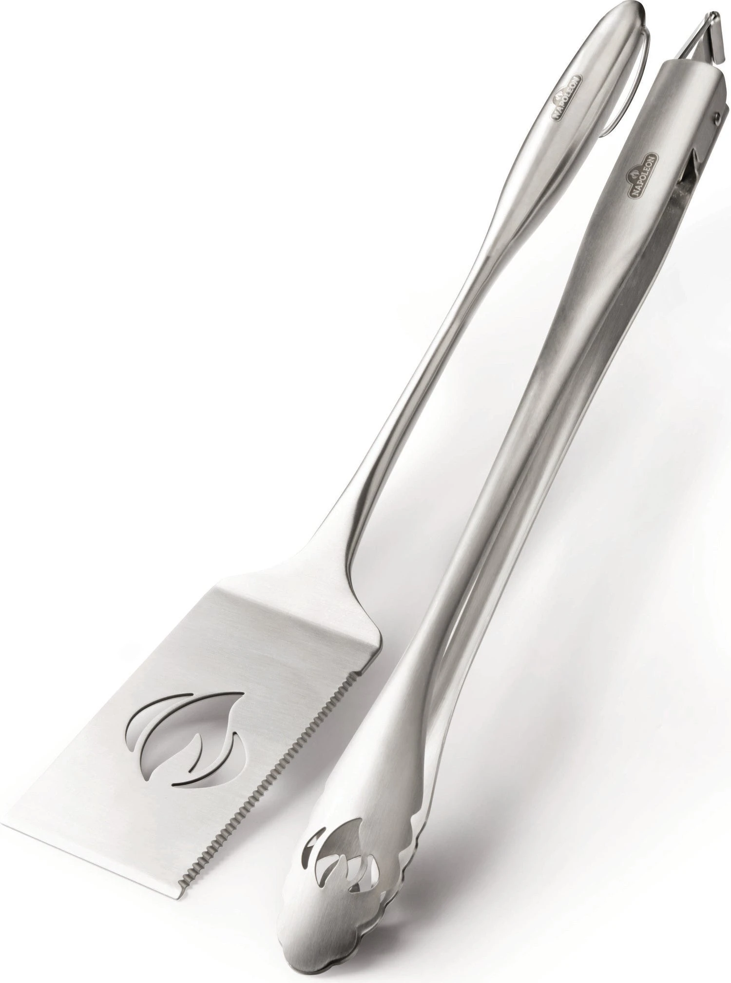 Tweedelig Napoleon RVS barbecue gereedschapset, bestaande uit een barbecue tang en een spatel met vlammenteken.
