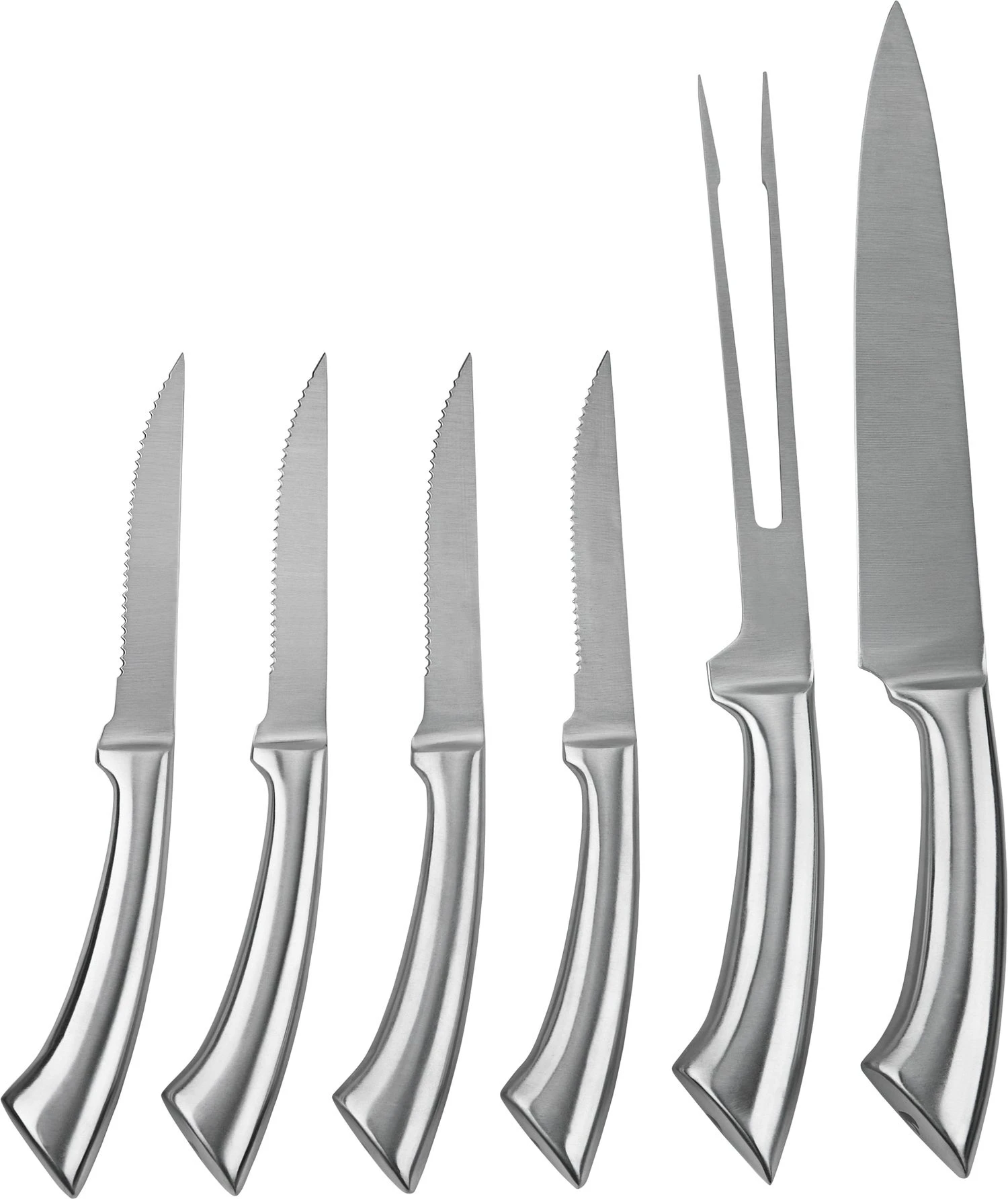 De professionele Napoleon Pro messenset van roestvrijstaal heeft alles wat je nodig hebt om vlees perfect te snijden en te verdelen onder je gasten. Het trancheermes uit de set is 34 centimeter lang, de trancheervork is 32 centimeter lang en de vier gekartelde vleesmessen zijn 24 centimeter lang. Alle gereedschappen bestaan uit een naadloos, enkel stuk waardoor je ze gemakkelijk schoonmaakt. De gereedschappen uit de messenset zijn perfect uitgebalanceerd waardoor ze goed in de hand liggen. Geschikt voor links- en rechtshandigen!