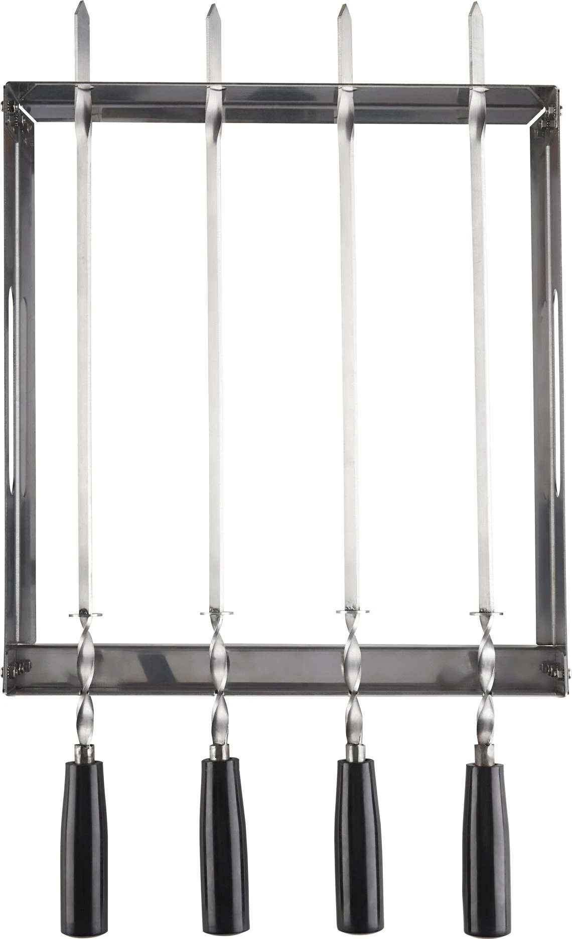 RVS houder met 4 Shish-Kebab-Spiesen met een lengte van 55,5 cm (incl. handvat). Simpelweg aan het handvat trekken en de spies draait zonder dat u de deksel moet openen.