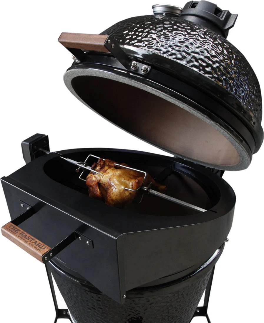 Te gebruiken als rotisserie en als pizza oven. Door de handige deur aan de voorkant blijft de dome gesloten waardoor je het vuur op kan stoken en de warmte goed vasthoudt. De rotisserie oven wordt geleverd met een dikke pizzasteen op maat. Daarmee is het de ideale pizza accessoire voor jouw Bastard. Het demontabele draaispit heeft een sterke motor en grote klauwen. De rotisserie heeft een diamter van 64,5 x H 25,5 cm.